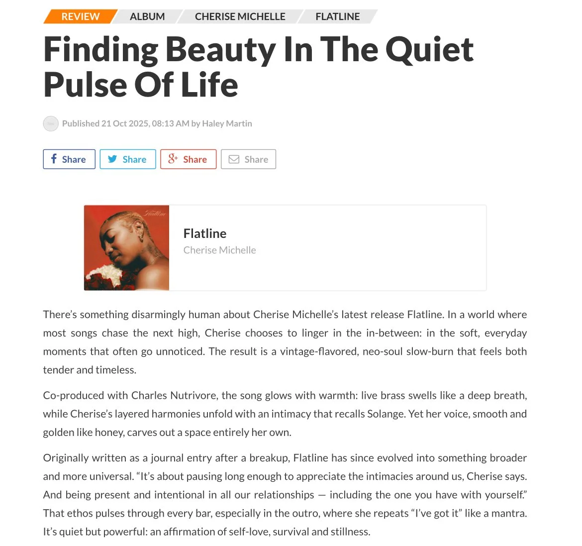“What stands out most is Cherise’s organic feel for music. There’s room for air, for instruments, for improvisation, for the listener to breathe alongside her.”